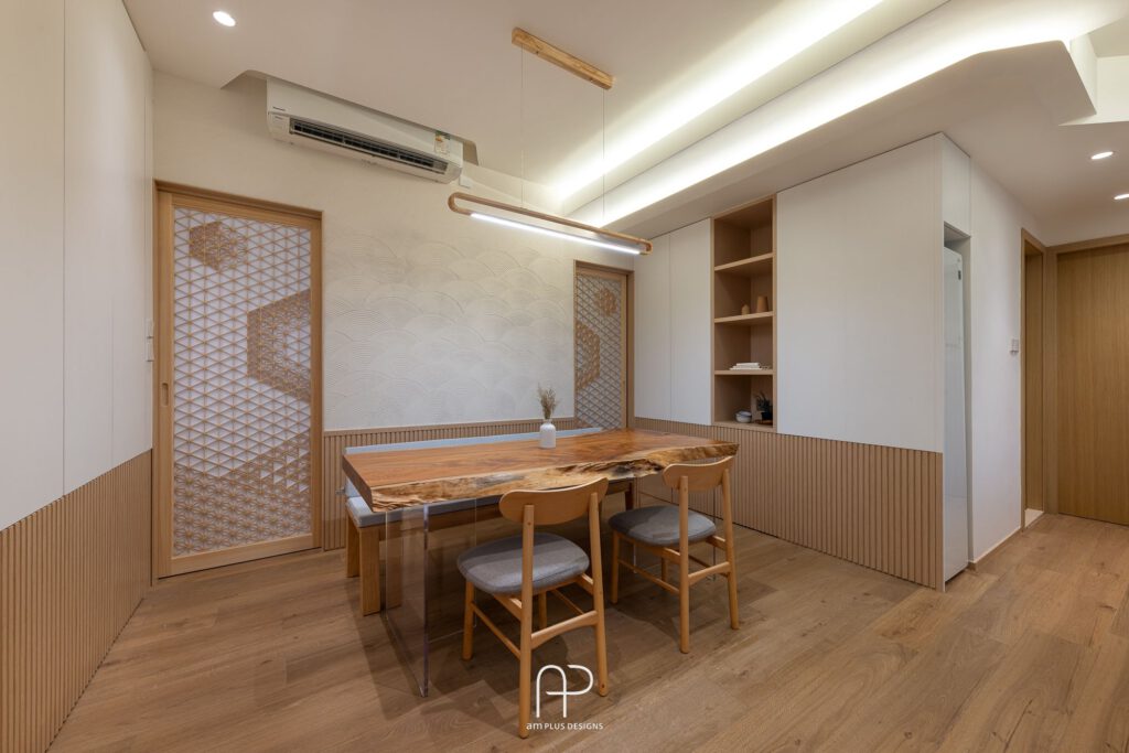 飯廳區域則以日系木製飯台、木吊燈為全屋焦點;而後方的珪藻泥牆身則結合半流水紋路及扇形造型,營造出猶如置身雲層效果,與玄關牆面相互呼應。
