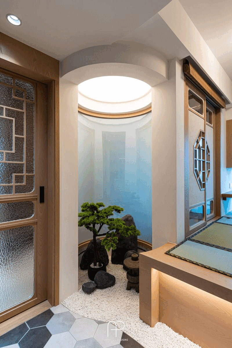 - 中式庭園元素: 玄關處的仿原木橫樑、碎石地面,以及中心處的屋內中庭,皆融入中式庭園的設計元素,營造出寧靜致遠的氛圍。