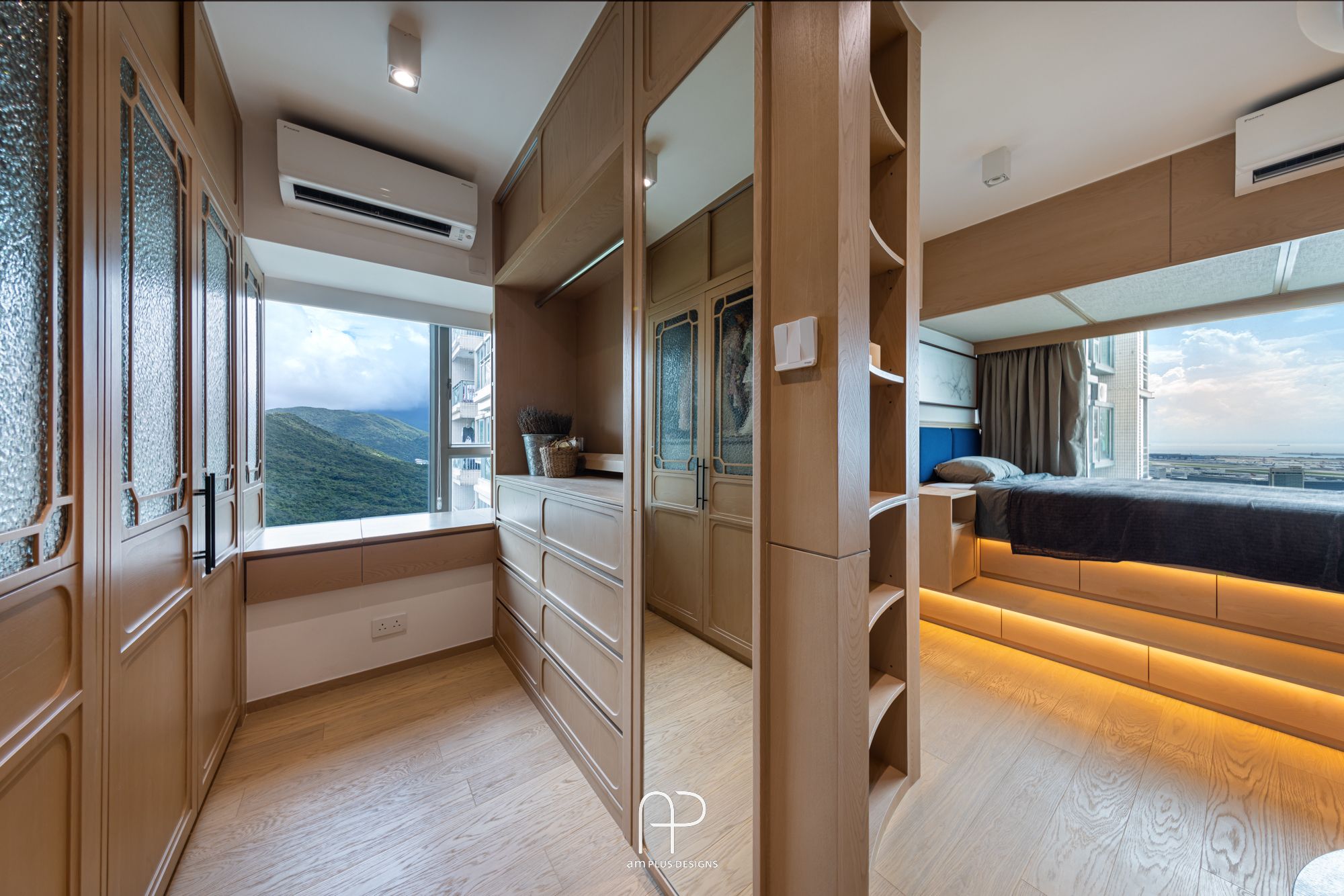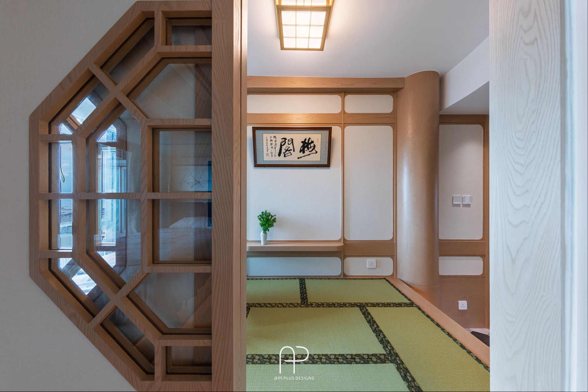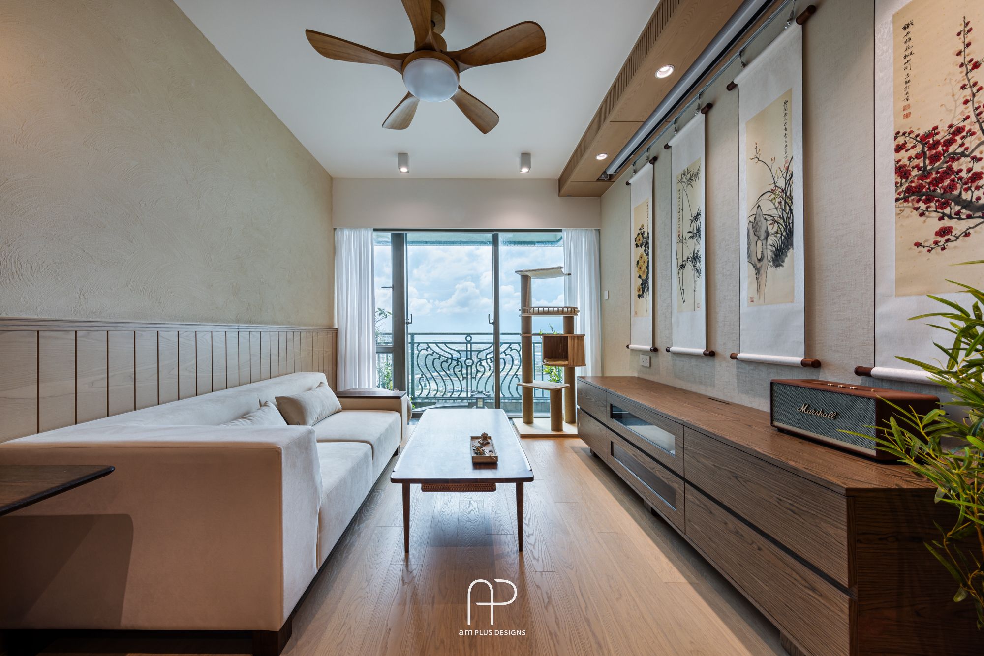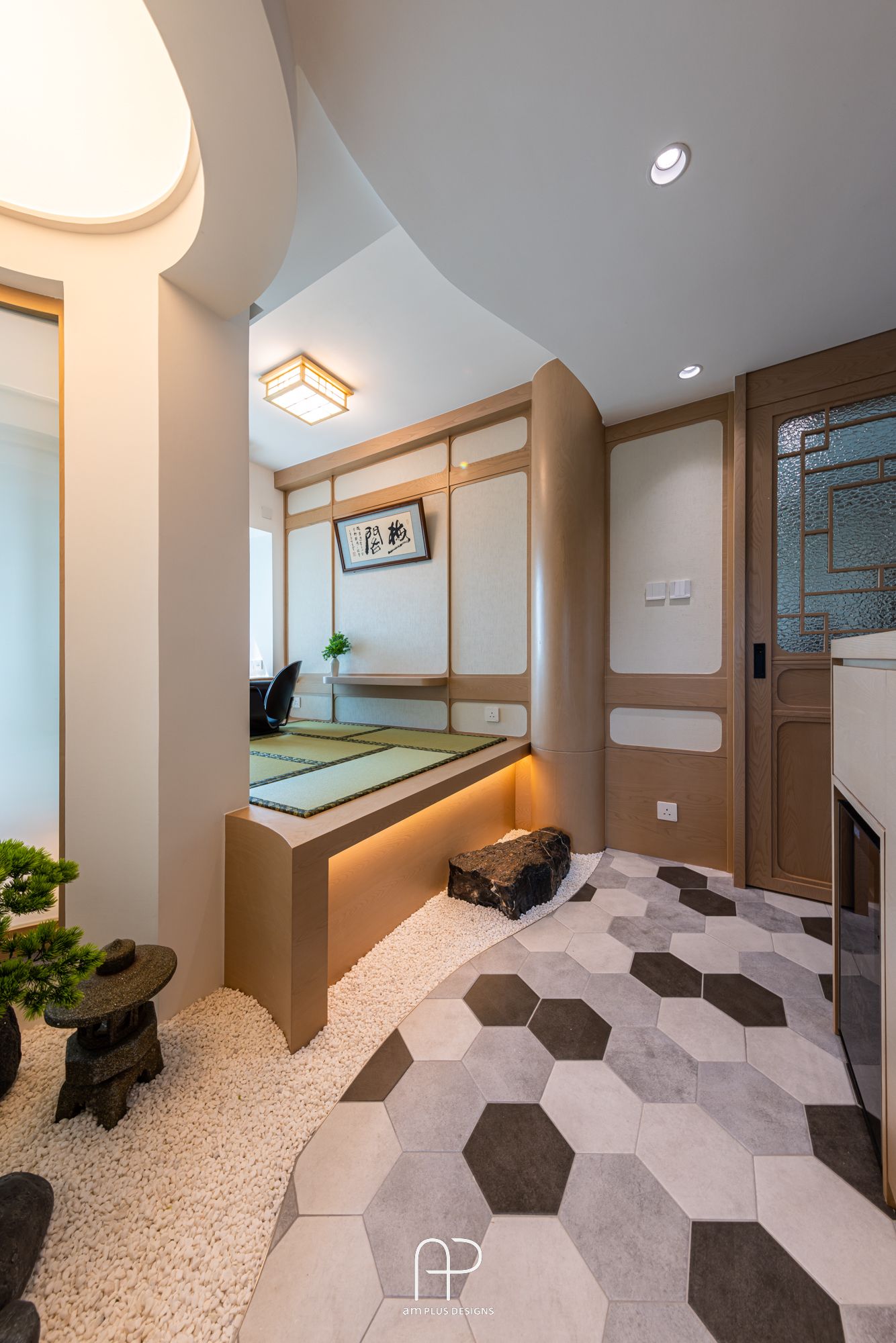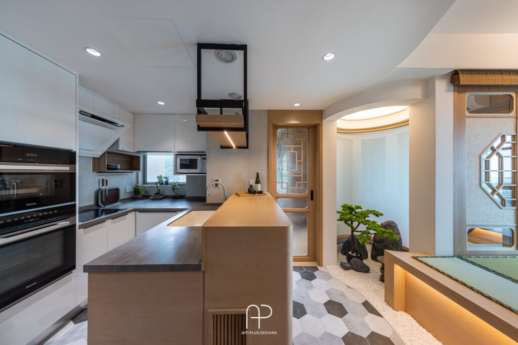 amPLUS Designs 以「新中式庭園風」為設計理念,為映灣園住宅打造充滿自然寫意的家居空間。此設計揉合傳統中式建築特色與現代簡約風格,並巧妙運用自然元素,營造出和諧寧靜的居家氛圍。